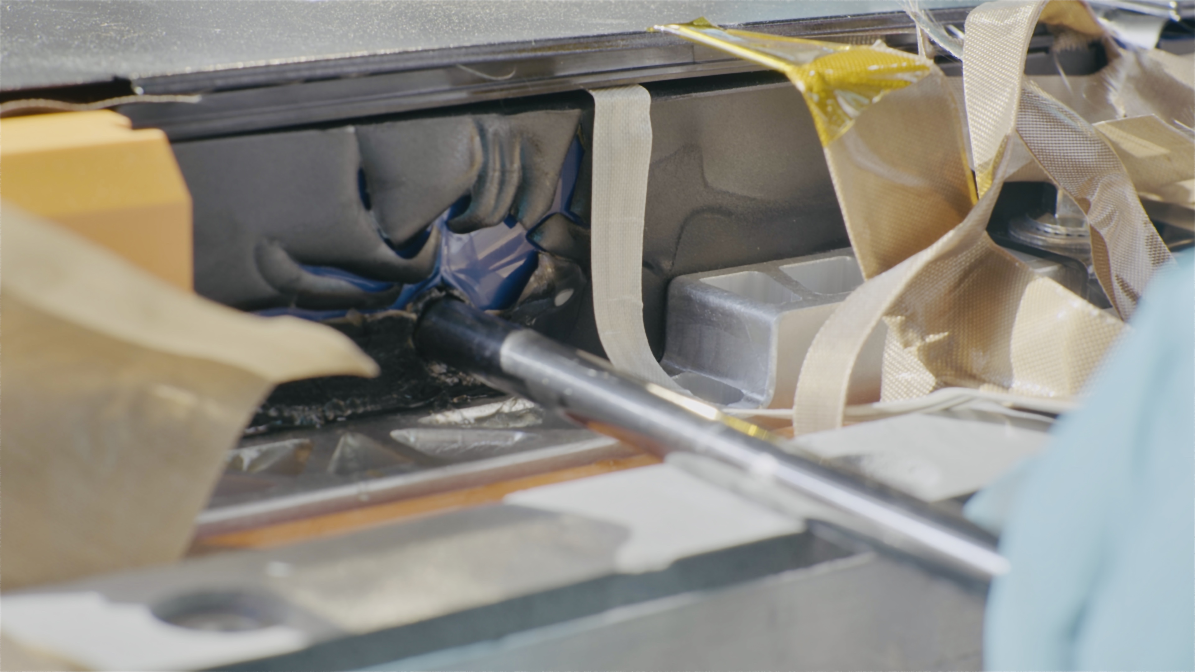 试验结果显示,磷酸铁锂(普通电池)整包在钢针刺入电芯触发热失控后,出现了电压下降、温度上升现象,最高温度为329.4℃,且出现冒烟现象,持续16分钟;而磷酸铁锂(弹匣电池)整包被刺后,最高温度仅为51.1℃,静止48小时后,单体电压降至0V,温度降为室温,且无冒烟、无起火和爆炸现象,电池包状态稳定。打开电池系统外壳,其内部结构完好。