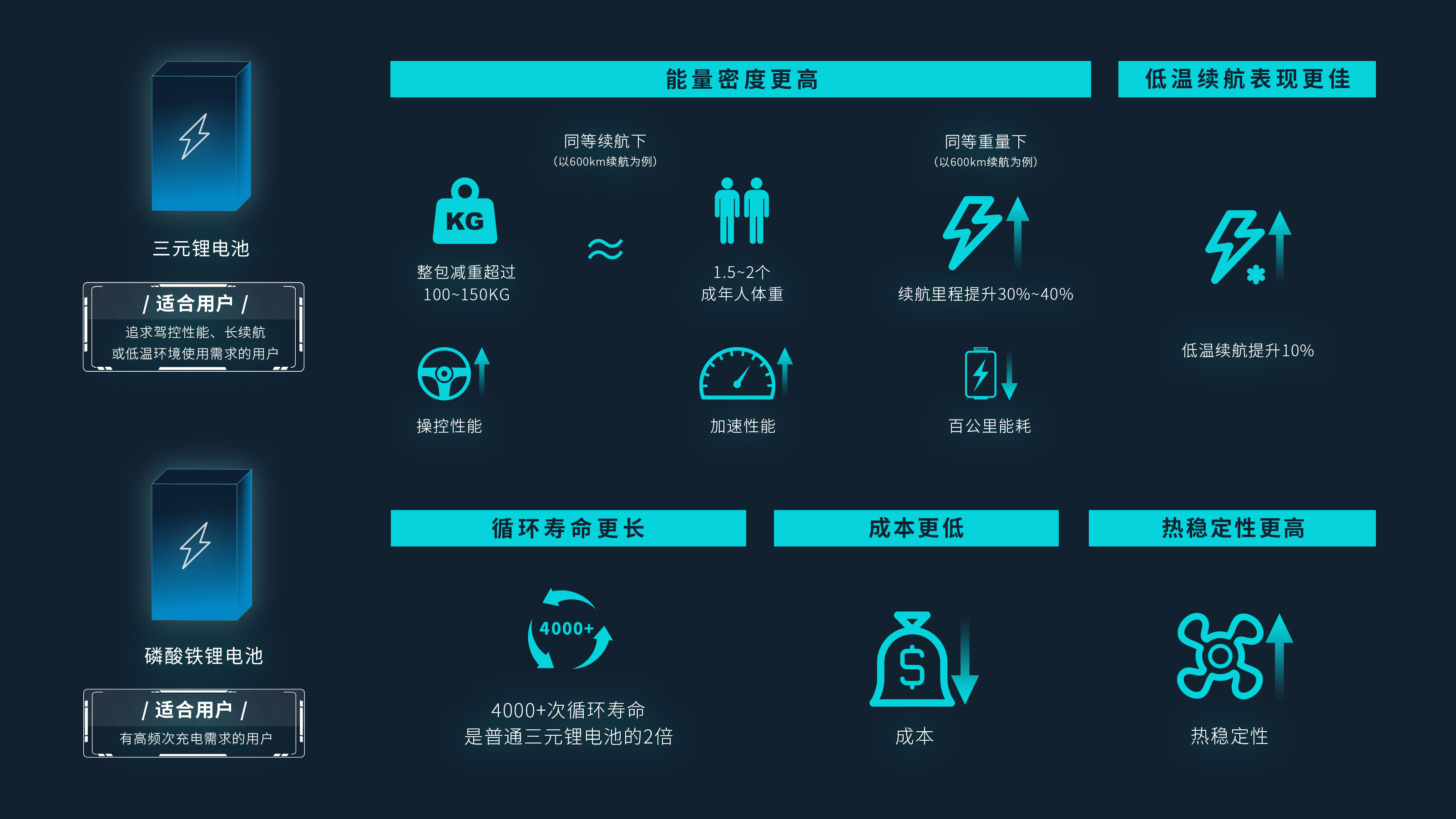 刚才我们已经提到了,三元锂电池和磷酸铁锂各有各的特点和适用场景。比如三元锂在同等600km续航的情况下,电池整包的重量可以比磷酸铁锂电池轻100-150kg,对整车的轻量化和操控性、加速性会有明显的提升,更适合追求驾控性能和超长续航的客户。三元锂电池在低温环境下的续航能力比磷酸铁锂电池高约10%,在冬季会实现更长的续航表现。