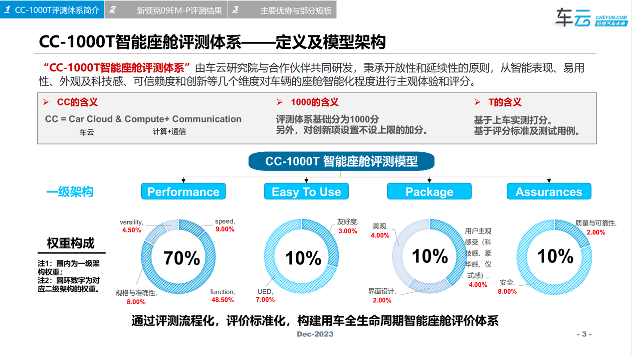 CC-1000T是车云研究院与合作伙伴从消费者体验角度出发,共同研发的智能座舱评价体系。“体系”将从性能、功能、旅程和座舱创新四大维度,结合用户需求、功能诉求、核心旅程体验和因车而异的独创功能,以打分的形式,综合评价各款车型的座舱智能化表现。