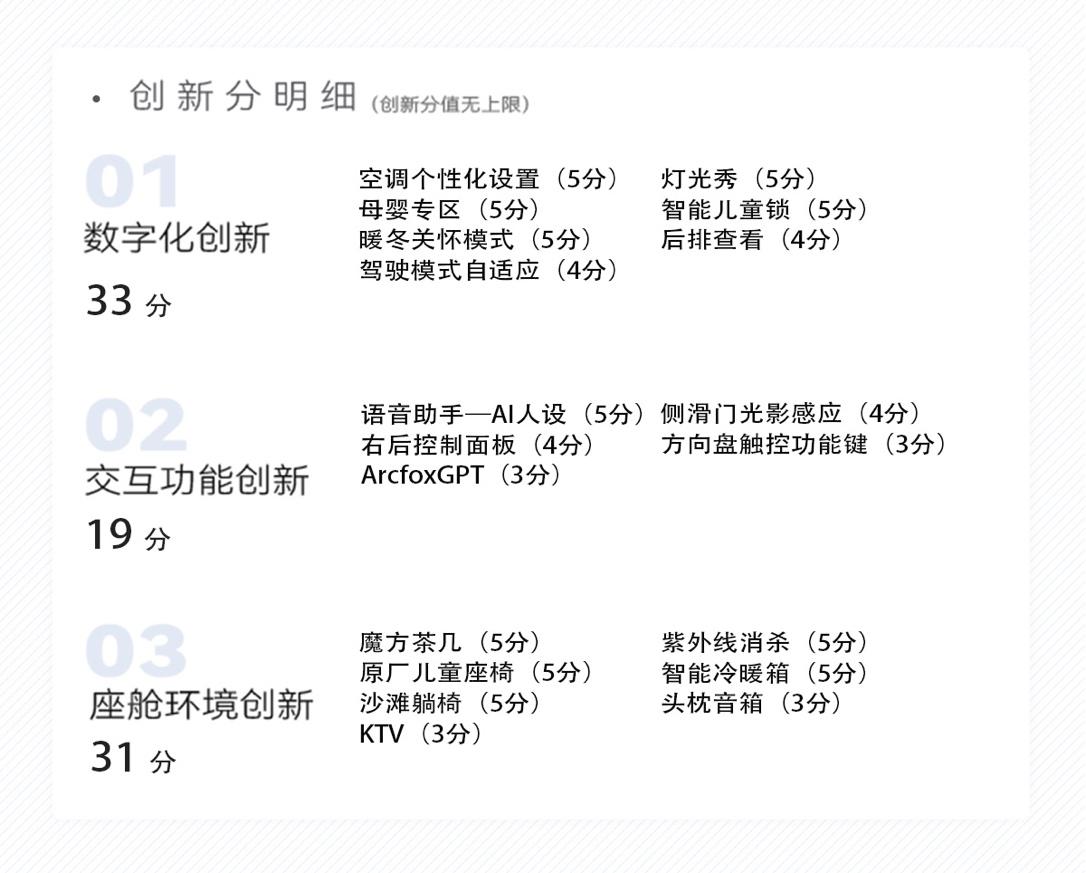 从上图可见,极狐考拉的数字化创新得分最高,座舱环境创新其次。结合我们列出的创新项来看,近半数创新功能围绕亲子出行场景展开,其中近半数是侧重儿童体验的功能,与自身产品定位呼应。与此同时,这些创新项也在乘坐、驾车、照顾孩子等场景下,提升了宝爸宝妈们的用车便利性。