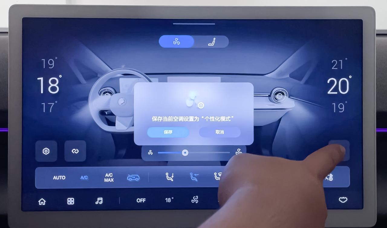 一款产品、一项功能面向市场时,必然会遇到众口难调的情况,支持内容自定义的“个性化”模式,成为了这种情况的解决方案之一,比如常见的个性化驾驶模式。而考拉选择在空调系统中加入个性化设置,完成温度、风量、吹风模式的设置后,长按相应图标即可将这些信息储存在个性化模式中,更改温度或风量等设置后,用户能通过右侧图标一键切换到个性化模式,更高效的将空调切换到最适合自己的状态。需要说明的是,空调循环设置与ECO模式启闭不与“个性化模式”绑定。