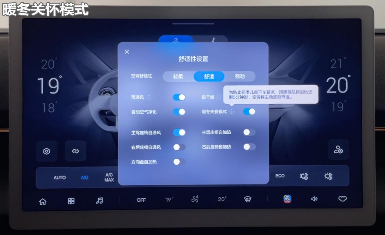 照顾宝宝的乘坐体验之余,考拉也考虑到了车内外温度对宝宝的影响,并在空调系统中提供了“暖冬关怀模式”,即快到目的地时系统将逐渐调低空调温度,通过减小座舱与外界环境温差的方式,让宝宝提前适应温度变化,后排家属也能借空调主动调温的间隙,为宝宝增添衣物,降低温差过大导致感冒的几率。