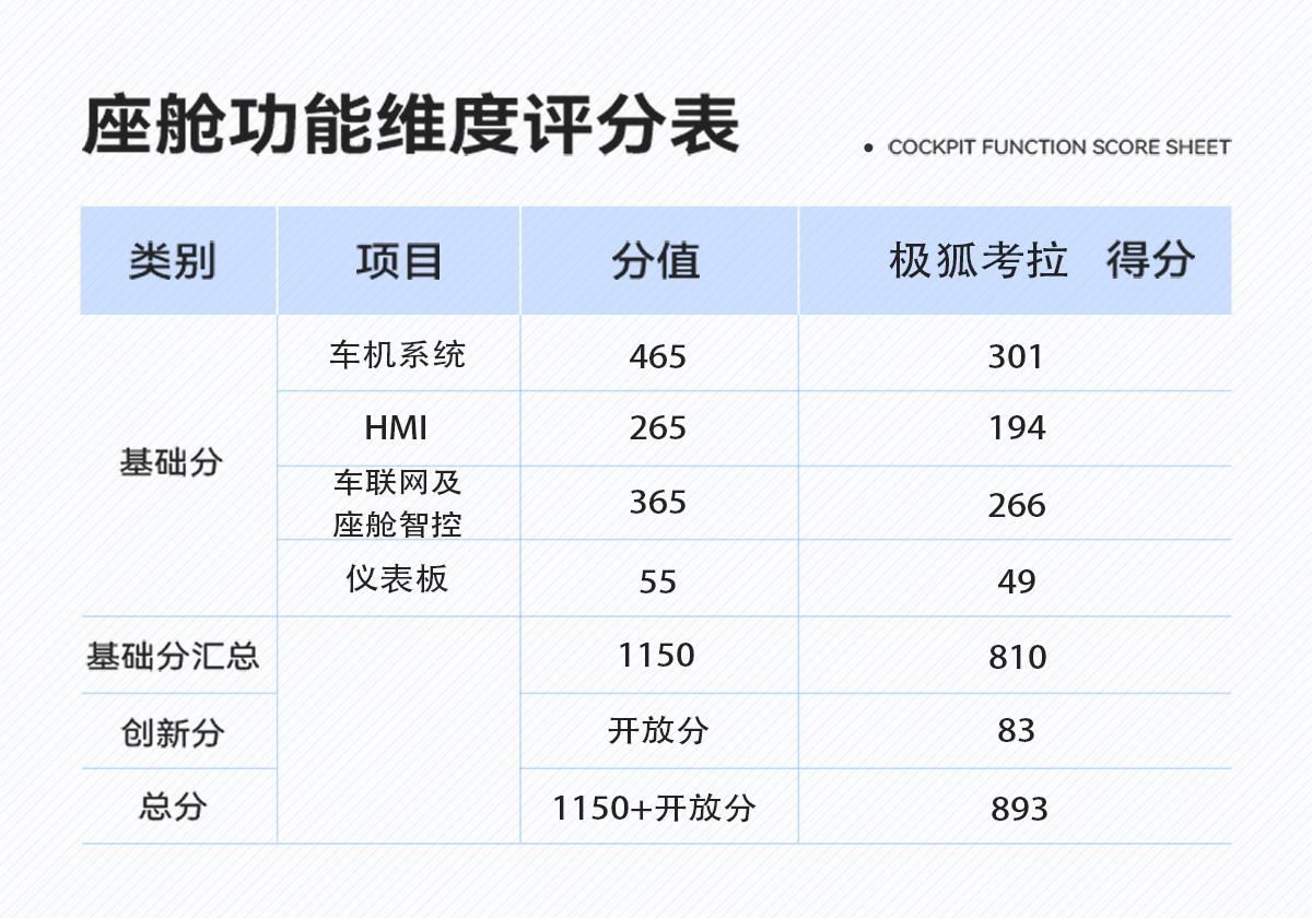 升级后的《CC-1000T智能座舱评测体系》,依旧包含基础项与创新项两部分,基础项共涉及230个评测项,每项5分制,满分为1150分。创新项作为独立评价,根据车型表现,同样每项5分制,但不设总分上限。基础项与创新项之和为该车型智能座舱表现的总分。简言之,如今的“4.0体系”,难度更胜以往,想得高分,座舱体验的“大格局”、功能体验的“小细节”以及打造座舱的创造力,三者缺一不可。