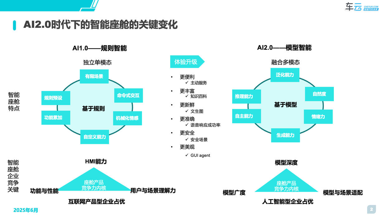 随着大模型的快速发展与落地,智能座舱也从AI1.0时代逐步进入AI2.0时代。从呈现出的关键变化来看,其特点主要表现为从基于规则的智能转向为基于模型的智能。