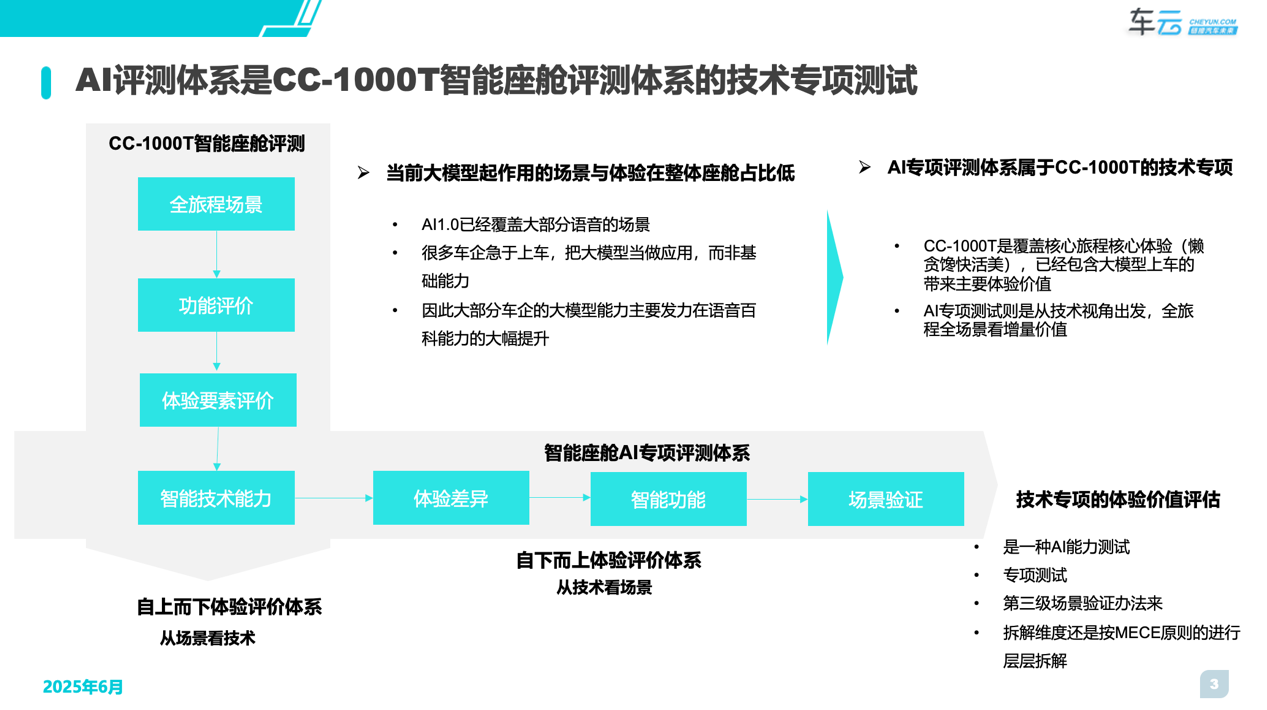 研究与搭建的过程中我们发现,当前AI大模型在智能座舱的用户体验中感知最高的依然聚焦在语音交互领域。而从用户的认知上传统的即AI1.0时代的语音交互是以“工具”属性为用户提供更加便捷的被动交互,而作为大模型赋能下的AI2.0时代的语音交互将以全新的“服务”属性为用户提供更加主动的移动智能体。当然从“工具”属性“向“服务”属性的转变依然会经历漫长的探索过程,但本着产品未至标准先行的原则,结合当前大模型在智能座舱领域的体验现状,车云研究院经过近半年的洞察与研究搭建出了《CC-1000T智能座舱AI专项评测体系》,目的是为各车企提供一把相对客观的第三方标尺。