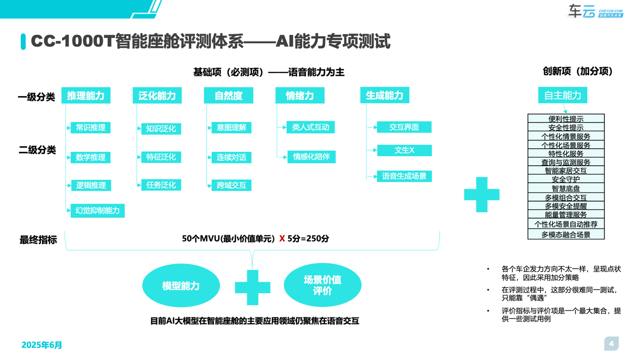 整个AI专项评价体系涉及约50项评价内容,分别从模型能力和场景价值两个维度来衡量不同车型在AI大模型领域的体验差异。