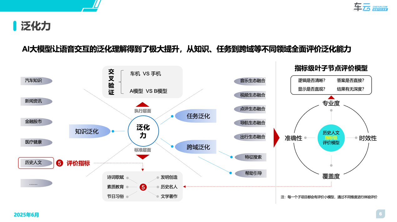 AI大模型的出现进一步提升了语音交互的泛化能力,主要表现为“知识泛化”、“任务泛化”和“跨域泛化”。根据用户在智能座舱域的用车场景与使用频率又分别进行了拆解,力求能够在泛化能力评价上从全面性与重要性两方面得到平衡。具体为: