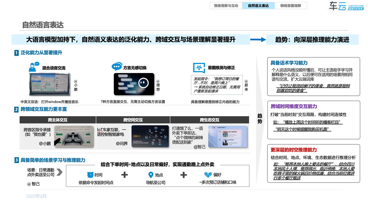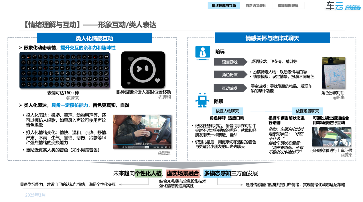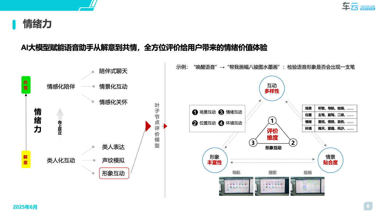 随着AI大模型多模态能力的增强,其互动性与陪伴性价值加速落地,旨在满足用户被理解、被倾听与被关注的需求。智能座舱通过语音交互从解意到共情,多角度为用户提供情绪价值。因此该部分能力的评价主要涉及两个方面: