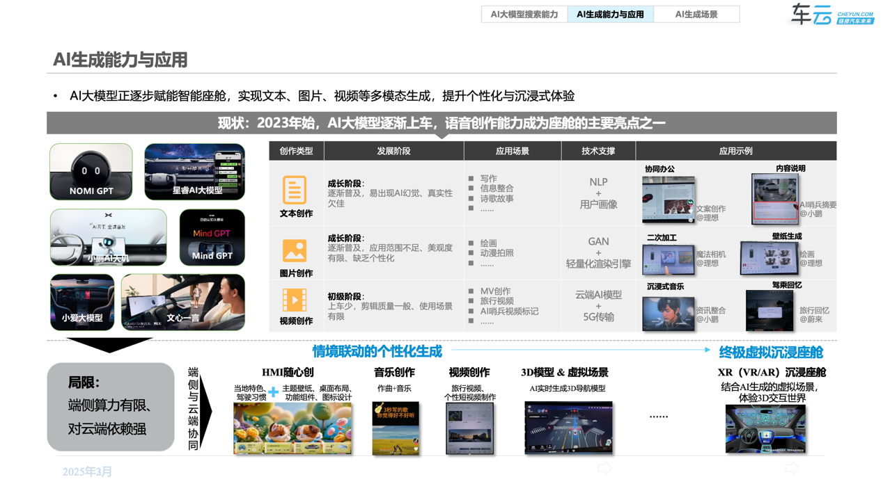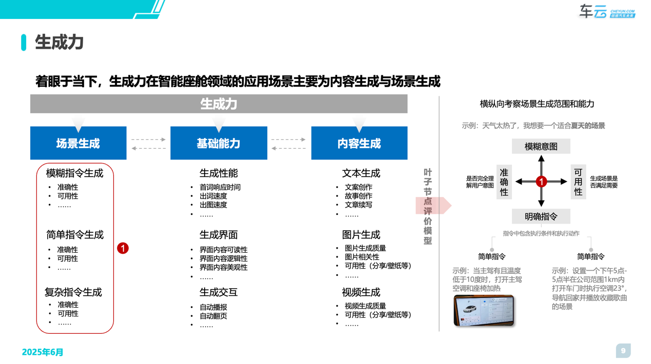 我们针对当前智能座舱应用场景与产品现状分析后,除了评价AI大模型生成的基础能力外,还针对场景生成能力和内容生成能力重点体验,具体指: