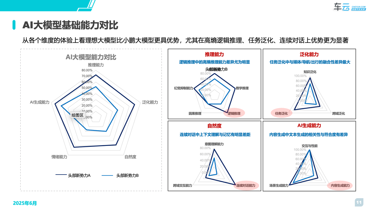 从两个头部新势力品牌的AI大模型基础评测项来看,其差异还是非常明显的,A车在推理、泛化、自然、清晰、生成五个方面全面领先于B车。其中高熵逻辑推理、任务泛化、连续对话中的上下文理解与内容生成中的场景符合度方面差异尤为明显。