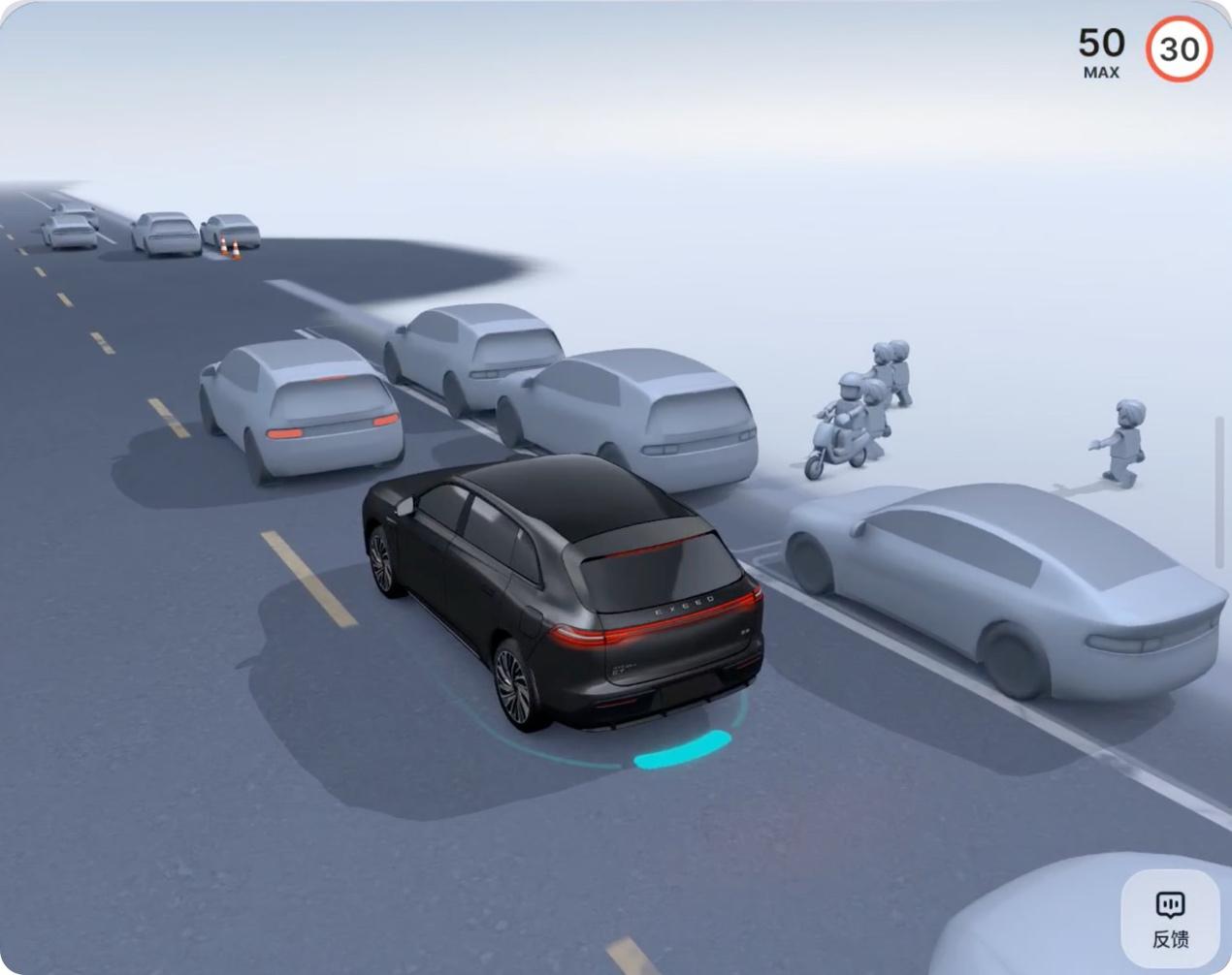 它辅助驾驶仿真画面不仅可以显示众多细分模型,还针对车道线进行了做旧处理,强化了场景真实感。另外,行人和骑行人也做了类似“乐高小人”的卡通化处理,不仅提升了情绪价值,还可以让用户快速识别到 “弱势交通参与者”。