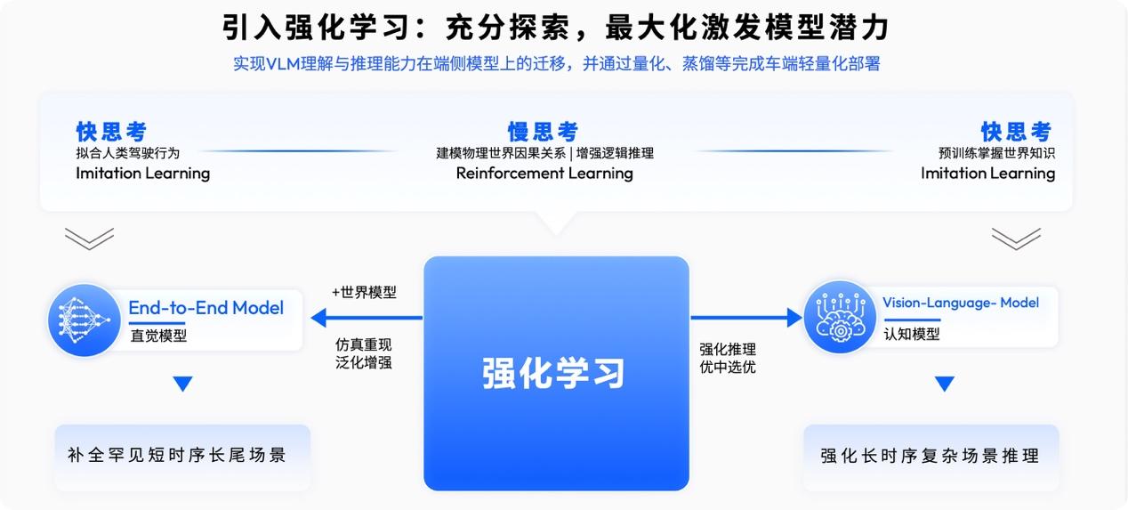 而“强化学习”是指它具有持续自我进化能力。比如完全无图、无明显道路边界的施工砂石土路,可自主识别道路与障碍物,推理出可通行区域顺畅前行。