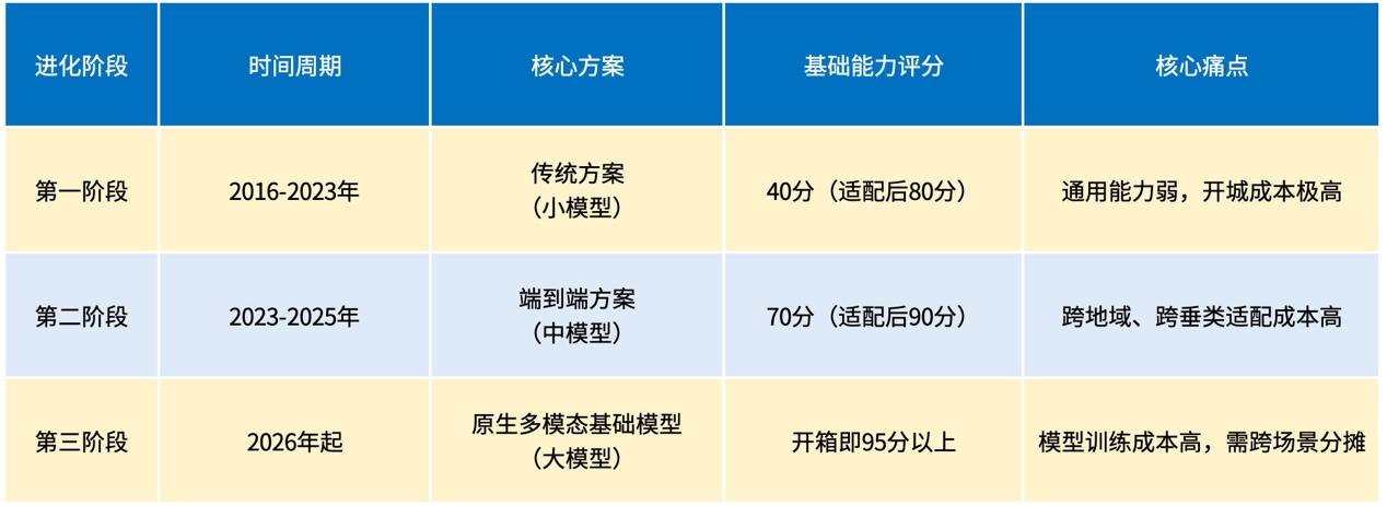 第一阶段(2016—2023年)是传统方案,也就是『小模型』阶段。这一阶段的智驾系统依托高精地图、小感知模型与规则决策规划控制算法,基础能力仅约40分,即便通过大量地域化、场景化的定制化适配,最终也只能做到80分左右。传统小模型模式的核心缺陷是通用基础能力弱、泛化性能差,『开城』代价巨大,每进入一个新城市,都需要重新采集地图数据、适配本地交通规则与驾驶习惯,投入大量人力物力,中小玩家几乎难以承受。